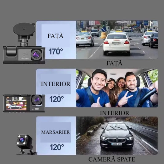 Cameră de bord 3 canale 1080p, Night Vision, Mod Parcare, G-Sensor, Detectare mișcare, Linii ghidaj marșarier